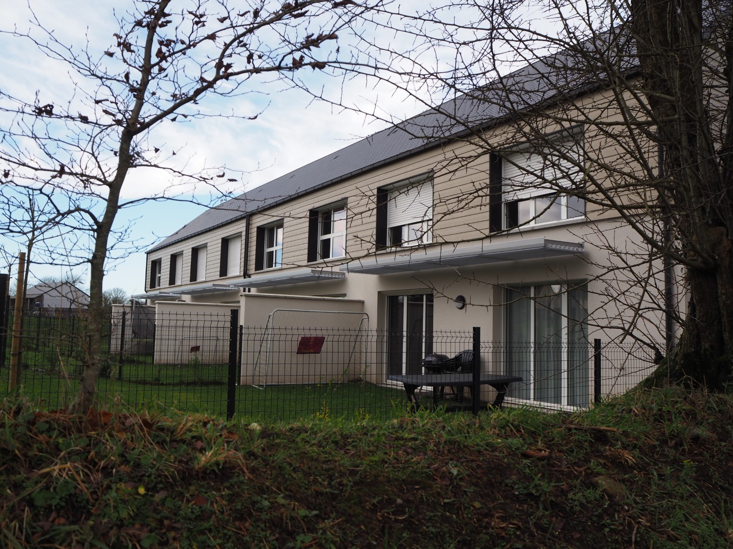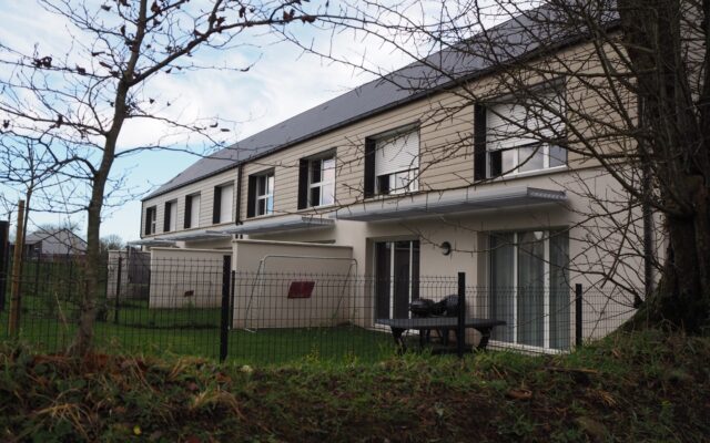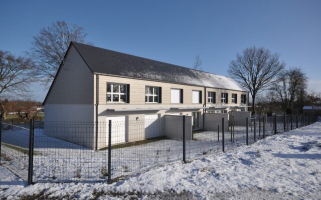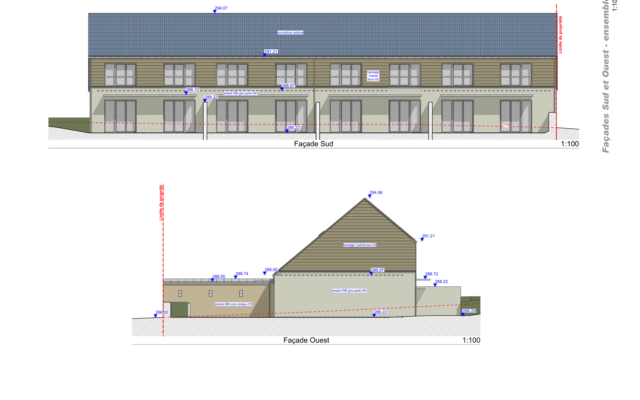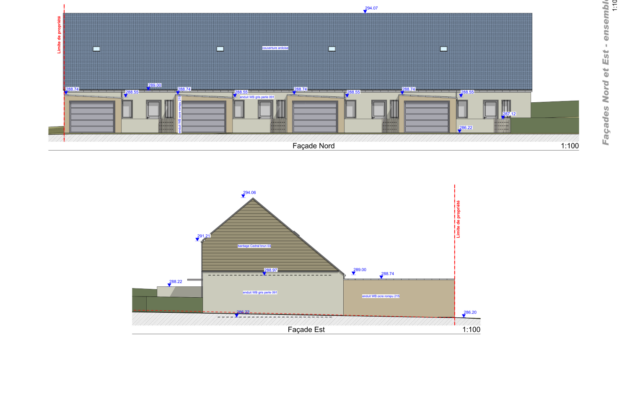 L’aspect bioclimatique a conduit à concevoir un volume unique, simple et compacte abritant les quatre habitations elle mêmes organisées sur 2 niveaux pour offrir une haute façade SUD captant le soleil et une façade NORD plus basse avec un rampant très long pour faire office de déflecteur au vent. Des brises soleils métalliques sont implantés au RDC de la façade Sud pour le confort d’été. Ils permettent également de séquencer la façade Sud.