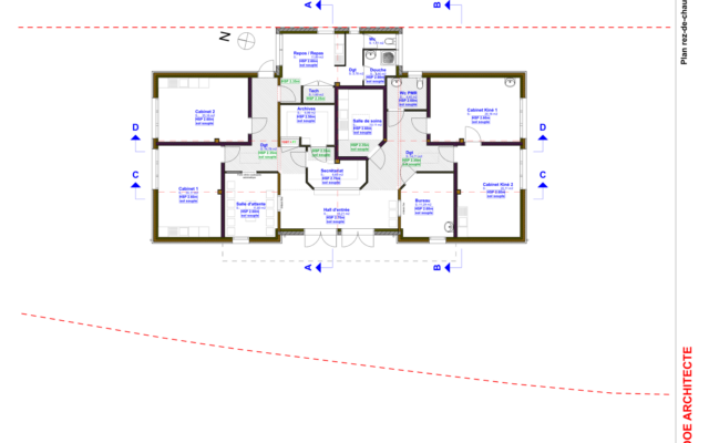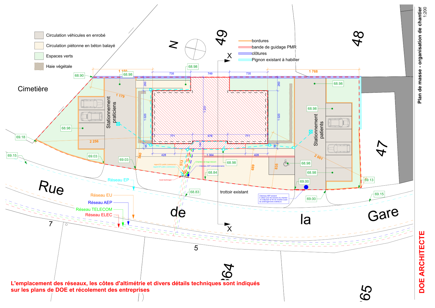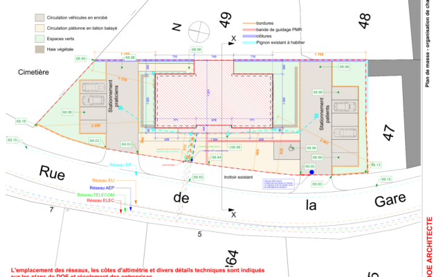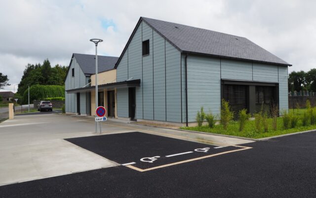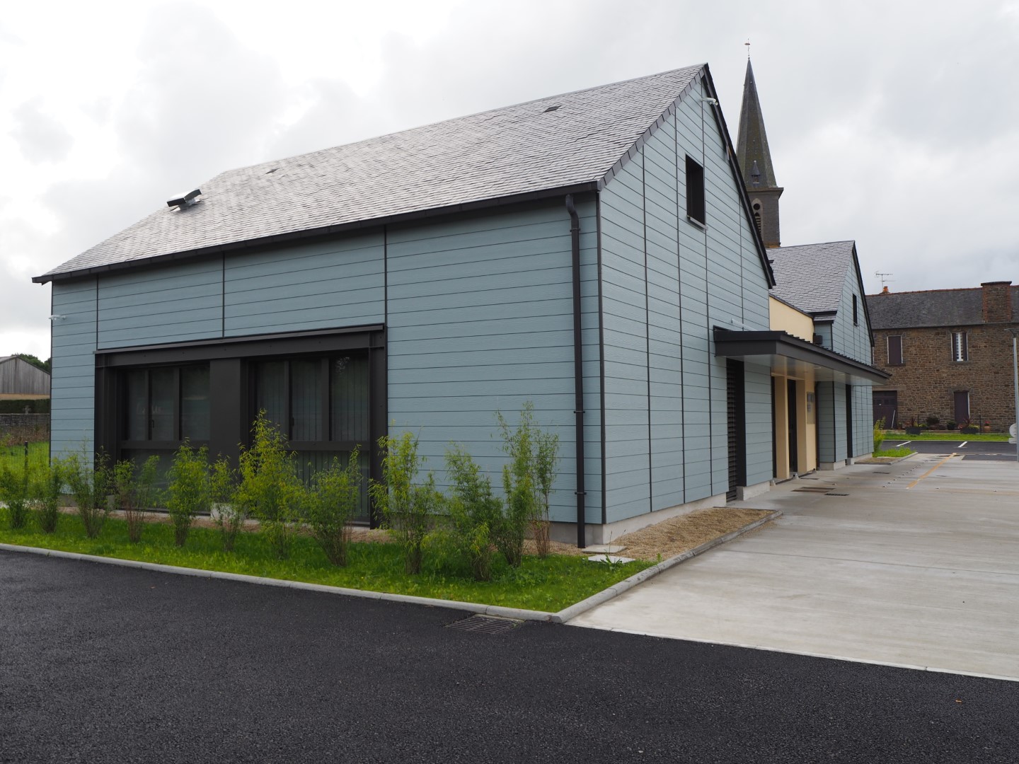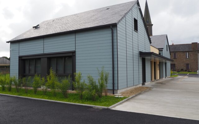 Les deux volumes à deux pentes sont en ossature bois bardée et la partie centrale est en maçonnerie traditionnelle, enduite. Le parti pris est celui de la simplicité et de l’intégration. Un auvent sur la rue marque l’entrée et permet par une simple intervention de reconnaître facilement le bâtiment