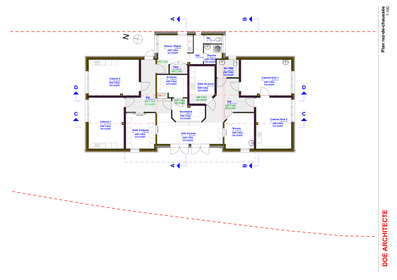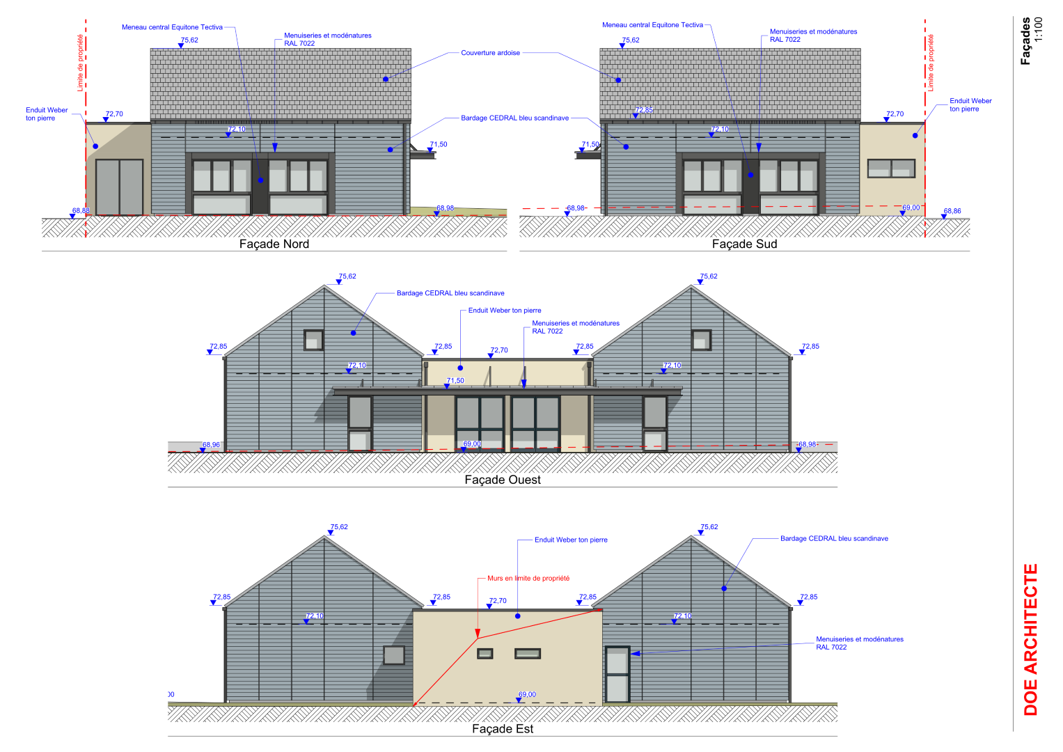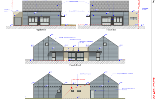 Le volume du projet est très simple. Le projet est composé de deux volumes avec une toiture à deux pentes, à l’image du bâti environnant, reliés par une partie avec une toiture terrasse.