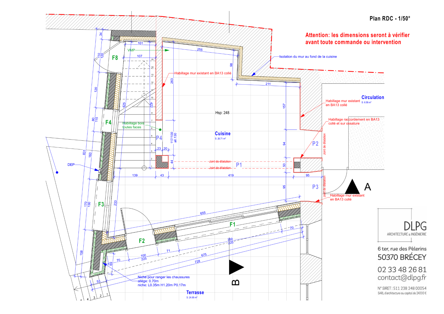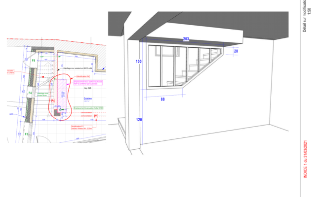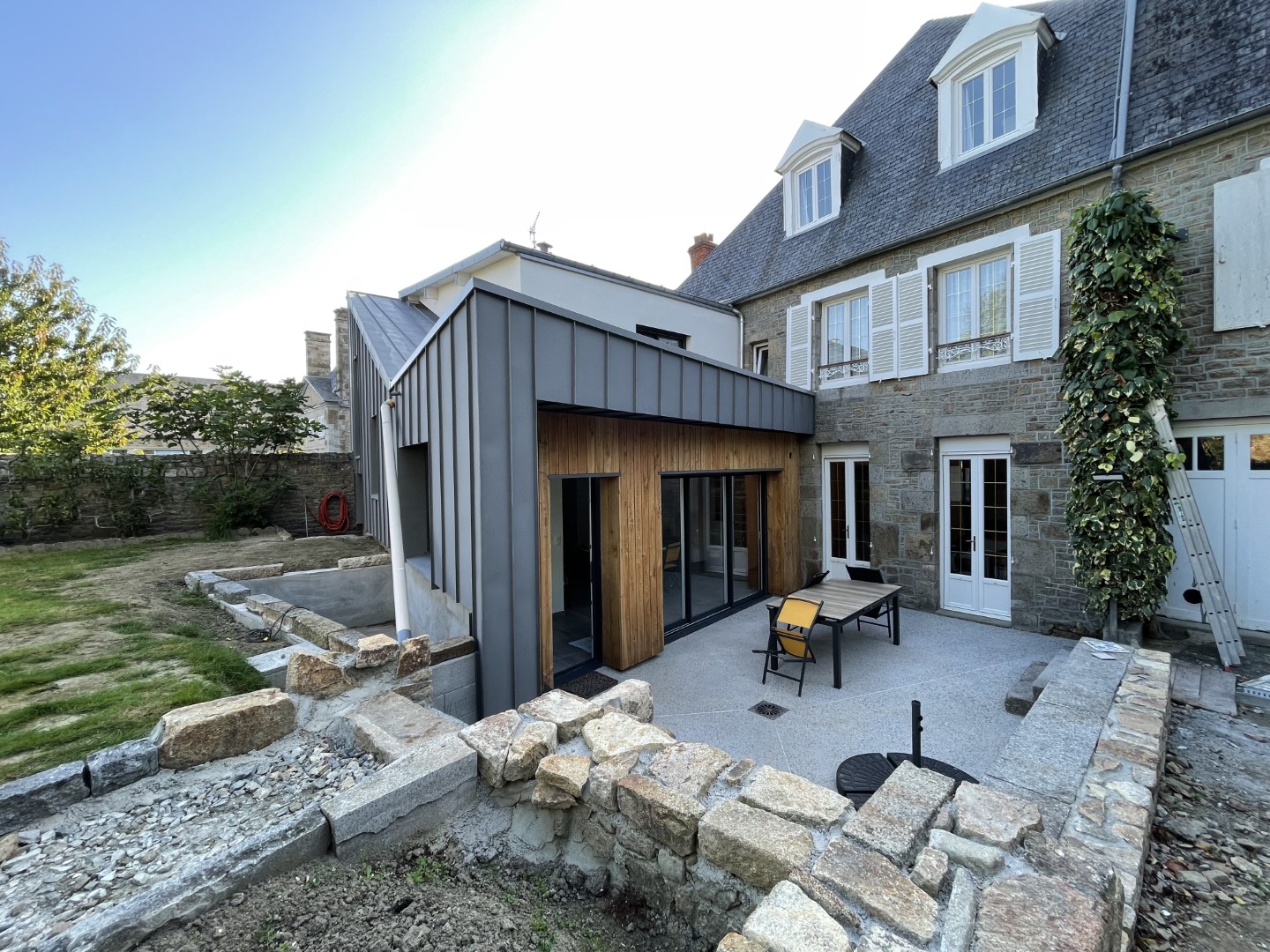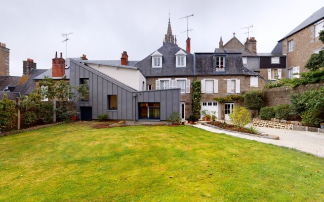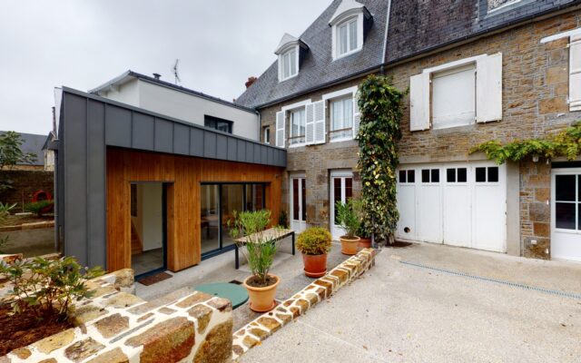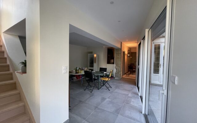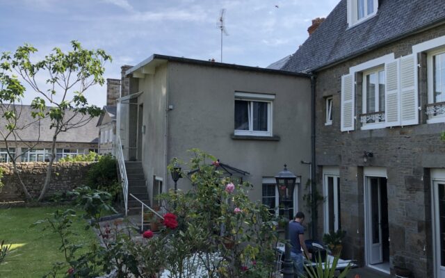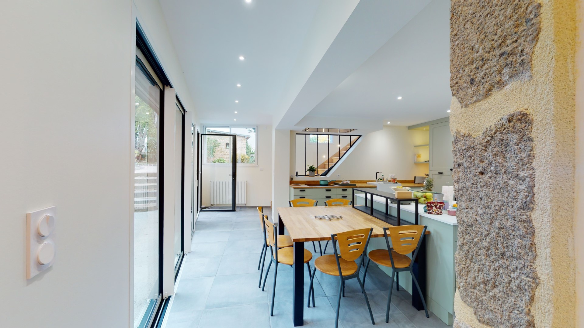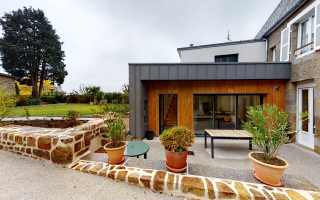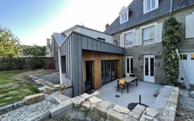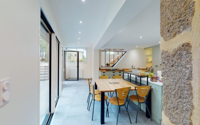 Une cuisine trop exiguë, mal isolée et sombre. Une chambre d’appoint à l’étage accessible uniquement depuis l’extérieur. D’une idée de véranda est née celle de l’extension qui englobe toutes les problématiques, améliorer la cuisine, l’isolation, la luminosité et permettre un accès au sec à la chambre d’appoint à l’étage en y ajoutant une isolation thermique supplémentaire.