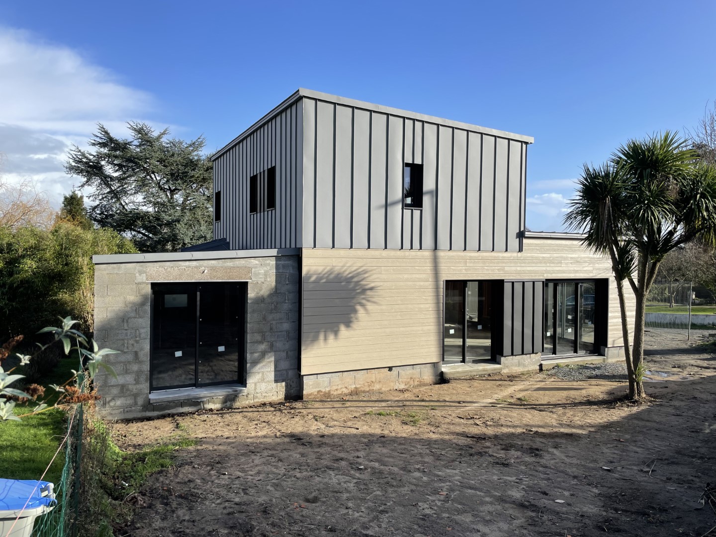 Les volumétrie sont simples, partant du volume initial, une surélévation afin de créer un niveau supplémentaire est créée sur sa partie Nord et une extension est également créée en simple RDC au Nord pour limiter l’impact visuel de la construction par rapport aux voisins et réduire son emprise au sol, la parcelle étant de dimension réduite. Les matériaux utilisés au RDC du volume existant sont un bardage de coloris brun, pour l’extension Nord qui vient en limite de propriété, un enduit monocouche de coloris clair et pour la surélévation, un bardage en bac d’aluminium de coloris gris à l’image du quartz zinc que ce soit en terme de coloris et de forme, avec des joints debout.