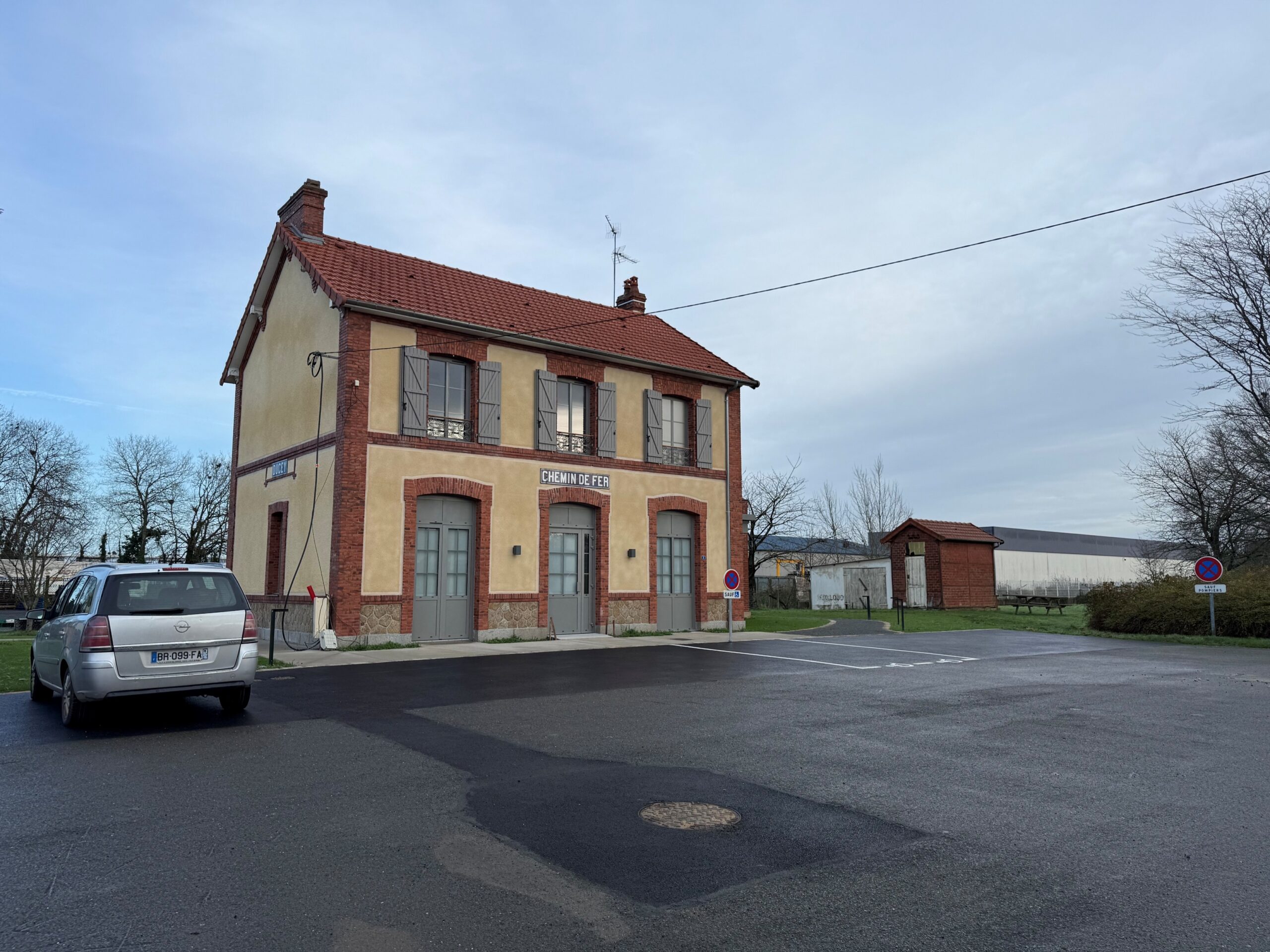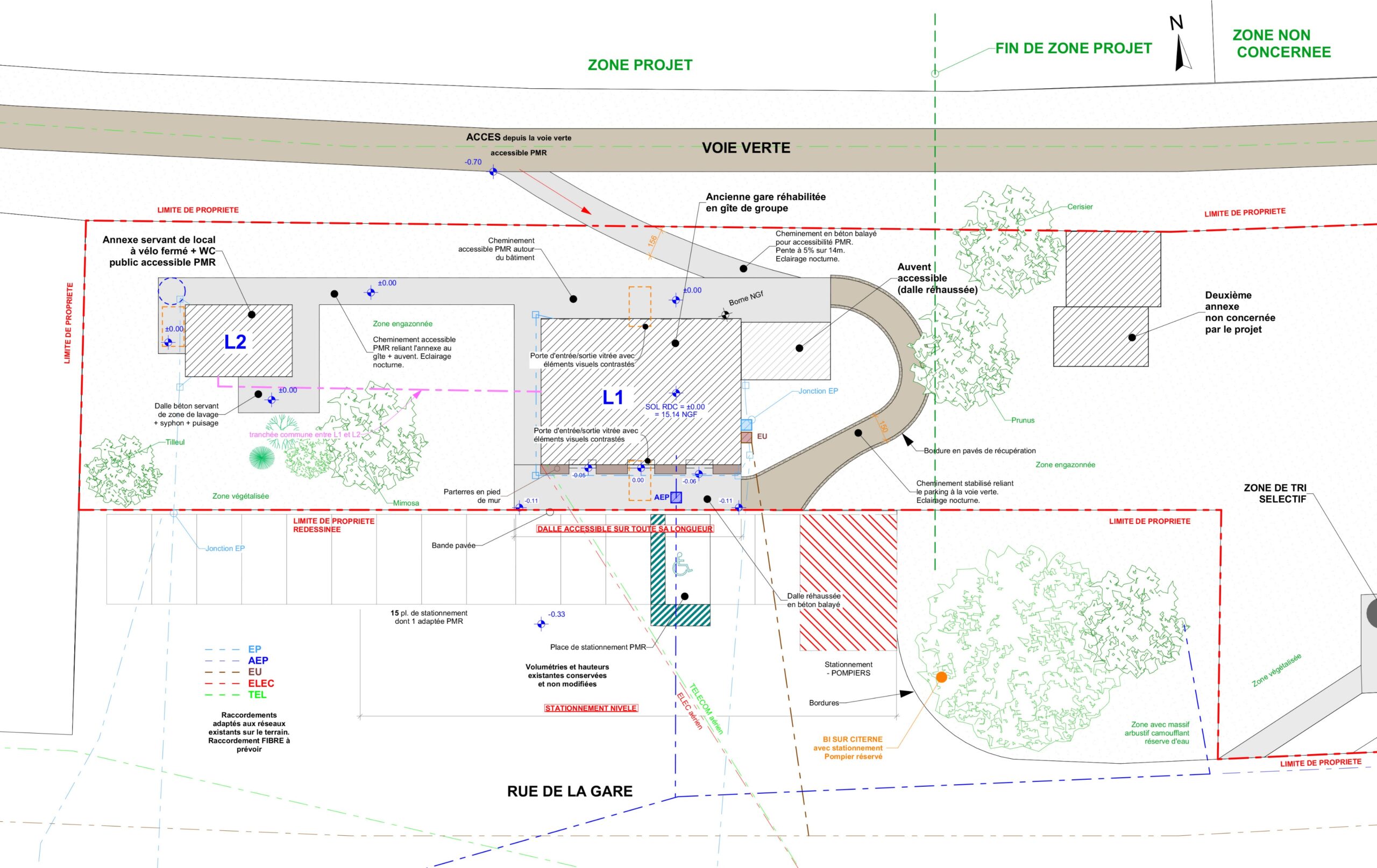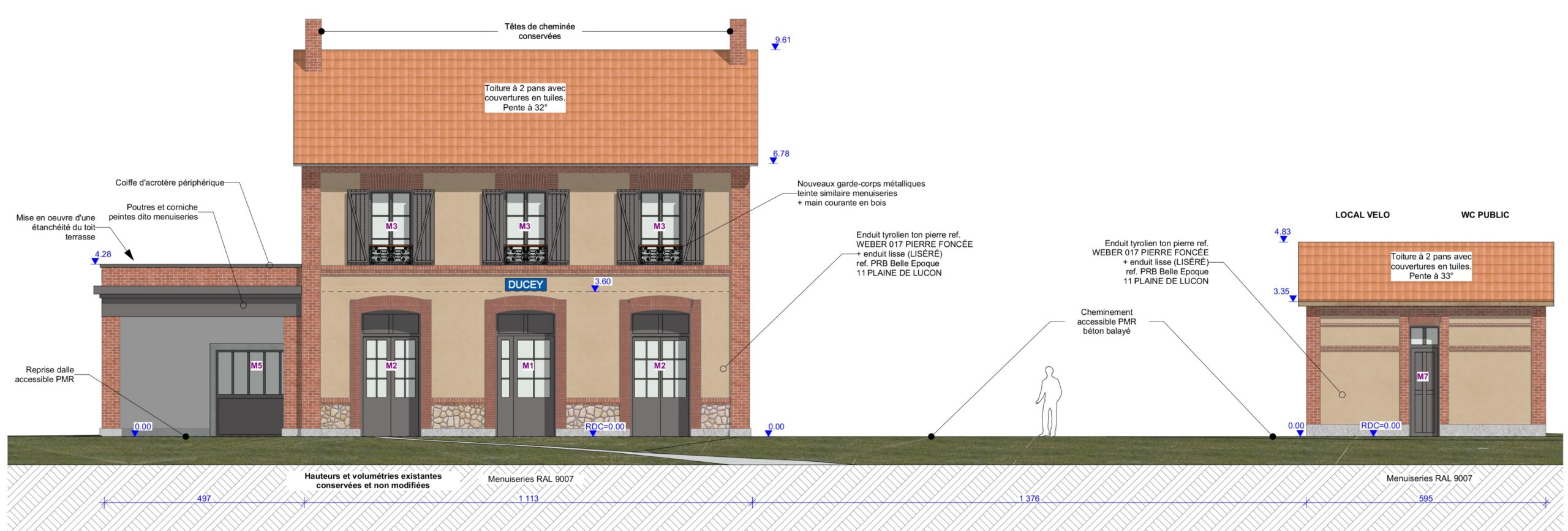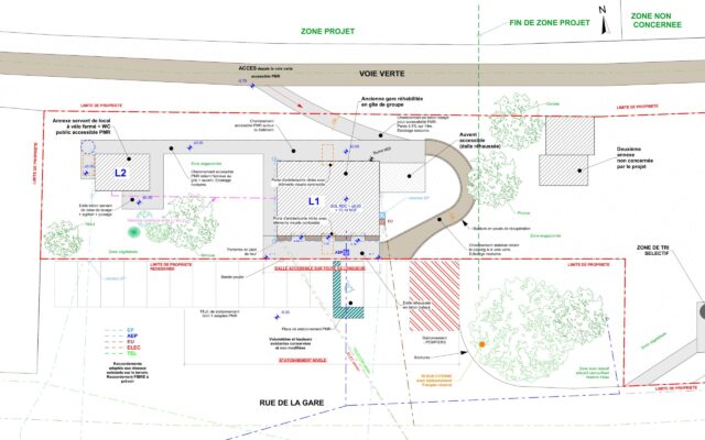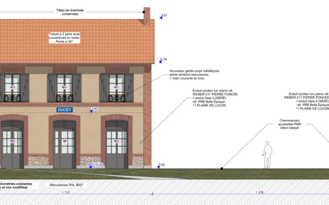 L’ancienne gare sera restructurée en gîte de groupe avec pour changement d’aspect le remplacement des menuiseries blanches du RDC et de l’étage en menuiseries de coloris gris foncé, la suppression des 2 fenêtres de toit au Nord, la restauration et/ou remplacement des garde-corps, des plaques de gare et des volets battants, ensemble peint de coloris gris foncé. Sa toiture à 2 pans avec couverture sera conservée.